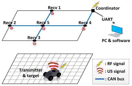 In our proposed system, the RF signal is used for time synchronization between the transmitter and all receiver nodes in distance measurements using TDoA. However, applying each RF transceiver unit to each receiver node is not a very effective way in terms of network management, system complexity and scalability. In a previous study [], the authors have successfully synchronized the network using a Zigbee network in master–slave topology. However, the problem in wireless network management will be more difficult with an increase in the number of sensor nodes. Specifically, data will hop between nodes before it arrives at the coordinator, resulting in routers being required to manage multi-hop Zigbee networks in this case. In addition, the RF transmission time can be omitted in distance measurement, but the message encoding and decoding at each node requires considerable time due to the limitation of the micro-controller, which cannot be neglected. For these reasons, a distributed synchronization network is proposed to enhance system scalability and reliability using a RF signal and CAN network in this present study. In further detail, the RF signal is used to synchronize the mobile transmitter with the coordinator. As all receiver nodes in ultrasound-based indoor localization are attached at pre-defined points and require power for operation, the CAN network can be established by adding two more wires to the power bus to replace the RF protocol in synchronization and management between the coordinator and all receiver nodes.