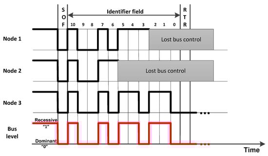 Similar to many other industrial wired protocols, the signals on the CAN bus is differential, which allows CAN to acquire its robust immunity to noise and fault tolerance. Differential signaling reduces the electromagnetic noise and allows a faster data rate over a twisted-pair cable. In particular, CAN uses a bit-wise arbitration mechanism to solve the collision problem. The Identification (ID) field of CAN message can represent both device information and message priority. The highest priority ID message always wins the bus access and keeps on transmitting when two or more devices start transmitting their message at the same time. An example to demonstrate this mechanism more clearly is shown in Figure 2. The CAN protocol includes five methods of error checking: two at the bit level and three at the message level. Due to all the reasons mentioned above, the total residual error probability of undetected corrupted messages is less than 4.7 × 10−11, as mentioned in a previous study []. These characteristics make CAN one of the most reliable and popular protocols in industry, which is the reason for our choice of CAN in this proposed system.