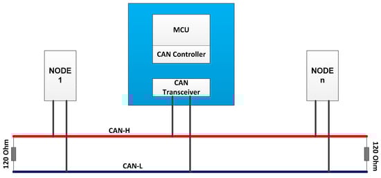CAN is a serial communication, message-based protocol, which is initiated by Robert Bosch GmbH for automotive applications. Since 1993, the CAN protocol has been standardized by the International Organization for Standardization (ISO) in ISO-11898 [,]. CAN is one of five protocols, which are chosen for implementing an On-Board Diagnostic (OBD-II), a vehicle diagnostic protocol. CAN is supported by many top semi-conductor companies, such as Texas Instrument, NXP and Microchip, and has become popular in various applications.