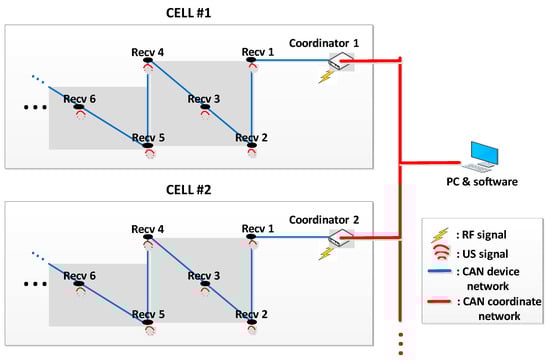 CAN replaces the complex wiring harness with a two-wire bus called CAN-H and CAN-L. Figure 3 represents a common CAN node/bus, as described by ISO-11898 [,]. This is also our system design, in which the coordinator and receivers talk to each other. This wiring simplifies our system installation and modification. Moreover, as stated above, CAN is a message-based protocol. It means there are many devices connected to the bus, with each device able to talk to one another. The CAN message is broadcasted in the network and devices can choose which one they want to accept by using a filter which is performed on the ID field of CAN message. This feature ensures the consistency of data in the network. Furthermore, this allows nodes to be added to or removed from the CAN network without requiring any change in the software or hardware of any other devices, even when system is operating (hot plug). This is the biggest advantage, which is comparable to other RF protocols, and allows our system to be easily extended in future studies. Extending the system can be chosen according to the scale of system by two ways: number of nodes in a cell or number of cells (Figure 4).