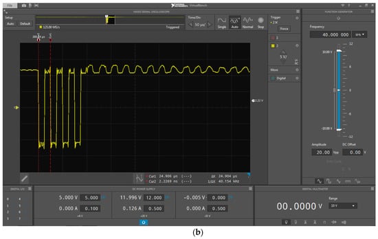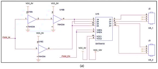 The transmitter device is equipped with a RF module for timing synchronization, a driver circuit and a transducer for generating an ultrasound signal. IC-SN754410 is used to boost transmission power. Combined with the IC-74HC14 Hex Inverting Schmitt Trigger, the voltage of the transducer is increased to 24 Vpeak-peak, which is the maximum value recommended in the specifications for the ultrasonic transmitter 400ST120. The main controller uses a Pulse-width Modulation (PWM) peripheral to generate a 40-kHz signal as an input for this driver circuit. The schematic of the ultrasound driver is shown in Figure 5a. The stack of a wireless protocol, which is called SimpliciTI (supported by Texas Instrument), is open source and is embedded on the main controller. This is a simple RF protocol, which supports the IC-CC110L sub-1 GHz RF transceiver. To put the system in operation, the transmitter needs to be attached on the target. At the beginning of each period, a RF signal is sent to indicate a trigger to receivers, resulting in multiple ultrasound waves being generated simultaneously. The emitting US pulse duration is 0.1 ms (about 4 wave cycles as shown in Figure 5b) and is managed by using a timer. The transmitter controls the sampling time of system by adjusting the RF–US transmitting duration. Currently, the maximum value of this period that ensures system functionality is at 20 ms or an updating rate of 50 Hz.