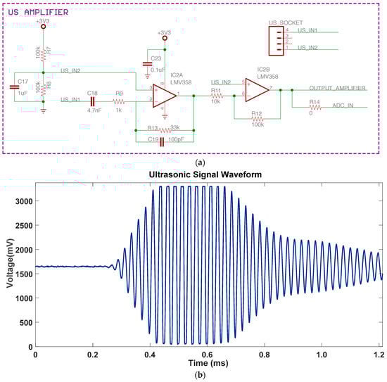 (a) Amplifier and Filter circuit; as well as the (b) US receiver signal after pre-processing.