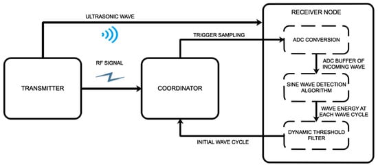According to the system configuration, the transmitter will first transmit a pulse of ultrasonic wave after sending a RF signal. Following this, the coordinator will wait for a RF trigger signal to initiate distance measurement procedure in all receiver nodes. Each receiver node will receive a broadcasted start message on the CAN bus, which is sent from the coordinator, to start distance measurement process. Following this, three stages will run in sequence to determine the initial wave cycle: ADC conversion, sine wave detection algorithm and dynamic threshold filter (Figure 10).