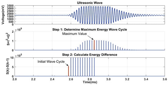 This digital filter is designed to eliminate the effect of the echo wave and circuit noise. In theory, the first beam that arrived at the receiver is the wave that was sent directly from the transmitter and has the biggest amplitude. This is followed by several echo waves with smaller amplitudes. Therefore, by spotting the wave cycle with maximum energy, the direct wave is pinpointed and separated from the echo waves. In addition, as the maximum energy is resolved by bubble sorting energy data at each trigger cycle, this value is dynamic and unaffected by the range of measurement and transmitting angle, which decides the amplitude of the incoming wave. Following this, the wave cycle with a maximum energy value is chosen as a starting point for the second step. The energy difference between the current cycle and the previous one is calculated repeatedly, starting from the detected maximum cycle back to the start of the buffer. The loop stops when a minimum threshold of energy difference is passed for the first time and the current cycle is chosen as the starting point of ultrasonic waves. Results of the dynamic threshold filter with real wave signal are shown in Figure 11. Finally, the time of flight is obtained by a calibration process to give a precise relationship between the initial wave cycle as well as the distance between the transmitter and the receiver.