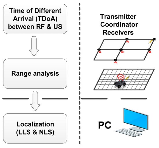 In recent years, location-based applications have increased rapidly, becoming of great interest to many researchers and big technology companies. Location information is a key factor for enabling a field of applications involving object guidance, path planning, human assistance, etc. Therefore, localization is a hot trend in the age of information technology and robotics. Global Positioning System (GPS), a global navigation satellite system that provides geolocation and time information to all GPS receivers anywhere on Earth, is currently popular. It is frequently used in daily activities and its receivers are embedded in every smartphone. For example, people can easily check where they are and navigate to a given point. Furthermore, GPS system can obtain errors of only a few meters in the outdoor environment. In the case of poor satellite signal condition, GPS technology augments the quality and precision of location using cell tower data. That is the reason why GPS is the best choice for many outdoor localization applications. On the contrary, GPS shows poor performance in indoor environments due to multi-path effects. The error of a few meters is also not accurate enough for indoor applications as there are relatively small workspaces and many obstacles located indoors. The updating rate is another disadvantage of GPS, with the refreshing frequency being only 1–10 Hz. Hence, many researchers are studying how to obtain high accuracy and a fast update rate in an indoor localization system. In survey and review reports [,,,,,], authors have presented many studies and their specification in recent decades. Many techniques and their properties are summarized as well. Infrared signal technology was first introduced by Harter, Hooper and their colleagues at the AT&T Lab of Cambridge University in the system called Active Badge []. This system involves room level localization and has an updating time of about 15 s, which is relatively slow. However, due to being simple and convenient, it was rolled out and widely used in a number of European and US universities. Ultrasound is the next solution that many researchers choose to implement. The Time Delay of Arrival (TDoA) technique is normally used to measure the distance from a transmitter to receivers, or vice versa. Following this, the target position is determined by using these distances and applying lateration methods. The Active Bat from Andy Ward and his colleagues [,] in addition to the Cricket Indoor Localization from Priyantha and his team at MIT [,] are good completed systems, which have been pioneers of this technique. Ultrasound-based positioning systems provide an accuracy up to the centimeter range but require a stationary structure and line of sight (LoS) condition, meaning that the user has to ensure that there are no obstacles between the transmitter and receiver. For more flexibility, using radio frequency (RF) is a solution. Its advantages include the lack of LoS requirements, wide range and ease of use. In exchange, the system accuracy is only at room level (i.e., 1–3 m). RSSI technique, which is based on information about the power of received signal, is used to determine the distance between the target and access points. In particular, Ultrawide Band (UWB), a low power RF signal with a wide spectrum of frequency bands, can be used to measure the distance by the TDoA or Time of Flight (ToF) techniques. Moreover, using UWB even enables a user to determine the Angle of Arrival (AoA), as reviewed in a previous study []. Ubisense 7000 sensor applied both of these techniques (TDoA and AoA). It supports an operating range of up to 160 m and has an accuracy around 15 cm in 3D positioning, with the update rate able to be configured from 0.1 to 134 Hz []. Decawave and Bespoon also used UWB technology, and their technologies are contrasted in a previous analysis []. In the case of combining with other visual purposes, such as map reconstruction, obstacle avoidance and so on, stereovision is the best choice. This technique uses image processing algorithms and relies on the feature points of captured images. However, it is not stable in dynamic environments, where there are moving objects or when the lighting is poor or inconsistent. Stereovision is also complex and difficult to use because the stereo camera needs to be calibrated before use. Moreover, stereovision provides relative location information. It means that the user is required to set the initial position with accumulating errors. In recent years, data integration and fusion are preferred because a single sensor signal has nearly reached their limitations. Additionally, this new approach combines two or more methods, which diminish their respective flaws. For example, in the short term, odometry can provide more accurate results than the ultrasound system but errors accumulate, leading to a high variation over a long time of operation. On the other hand, the ultrasound-based positioning system is an absolute localization and can be added to minimize the errors generated by odometry. This is the main idea of two previous studies [,]. This combination introduces a higher performance system by increasing the updating rate and enhancing the measurement results. Theoretically, there are many choices for fusing positioning sources, especially with ultrasound-based systems, such as Inertial Measurement Unit (IMU) and portable Ultrasound Range Sensor []; as well as Laser Range Finder and Ultrasonic Beacon []. Furthermore, there are other systems, such as IMU and Radio-frequency Identification (RFID) []; as well as IMU and Light Detection and Ranging (LIDAR) sensors []. Data fusion has been carried out by applying Kalman filters and Particle filters in most studies.