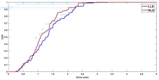 The target point needing to be addressed in the LLS method is (x−xj, y−yj, z−zj), while the cost function includes more measurement numbers (di and dj). Therefore, the error is amplified and higher than NLS. In comparison, the realization of LLS is considerably simpler than NLS and requires less math operators, especially matrix multiplying and inversing. The cost function does not have to be calculated repeatedly in each step in the iteration as NLS. Fortunately, the performance and resource of modern embedded systems are constantly increasing so they can perform more sophisticated functions compared to the past. Accordingly, there are no significant problems for implementing NLS on a microcontroller, such as STM32F4 in our system.