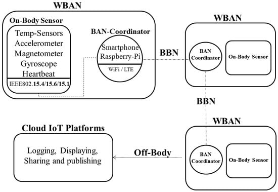 General architecture of the wireless body-area-network system. BAN: Body-Area-Network, BBN: Body-to-Body communication, Off-Body communication: all non-BAN and non-BBN communications.