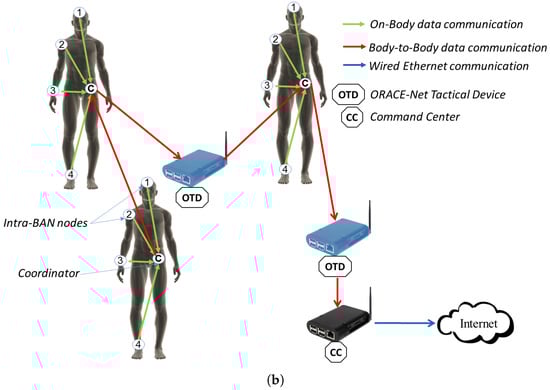 The CROW system is a set of wireless distributed devices equipped with wireless sensors intended to collect real-time data (i.e., vital signs, stress level, locations, ambient intelligence [28], etc.) from Wireless Body Area Network (WBAN) nodes towards a cloud IoT platform. Figure 1 depicts the general architecture of the next generation WBAN. A node in the proposed system could be either: (i) tactical (deployed by rescuers while moving inside the disaster area) or (ii) mobile (carried on-body by rescuers or trapped survivors). Tactical nodes establish a wireless tactical backbone, which extends the network coverage. Mobile nodes, being in proximity of the tactical backbone, could route packets through it as depicted in Figure 2b. We call these tactical devices ORACE-Net Tactical Devices (OTDs). Mobile devices carried on-body rely on both the OTDs and the other mobile devices to route data. Data collected from deployed nodes (i.e., tactical and mobile) are routed through the network towards the Command Center node (CC node). The CC node is a tactical command center deployed as a gateway allowing the emergency network to be linked to wide infrastructure networks (e.g., Internet, military platforms, other emergency networks, etc.). The CC node is also the node through which the operations’ commanders send their instructions to the rescuers and the rescuers send back their feedback to the CC node. It is important to note here that multiple CC nodes could be deployed and activated in the case of single CC failure.
