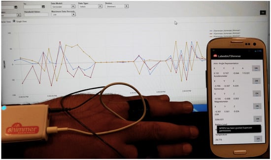 Shimmer sensors [31] are sensing devices capable of measuring physical quantities (e.g., acceleration, gyroscope X, Y, Z and angle, triple axis magnetic field, pressure, etc.) and sharing them via Bluetooth. Shimmer provides a Service Development Kit (SDK) that affords the possibility to read real-time data from the sensor by an Android or IOS mobile application. We place the Shimmer sensor on-body as shown in Figure 3. Once connected via Bluetooth, our mobile application (Labeeb-IoT Shimmer Sensing Android App) starts reading data from the sensor and sharing them with the IoT platform.