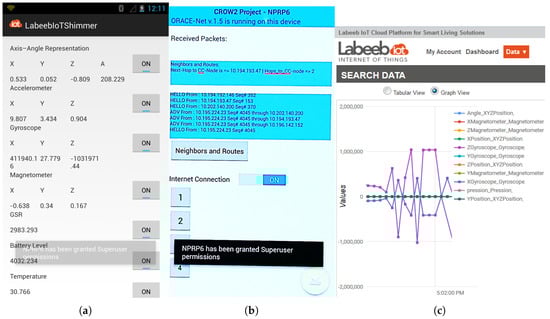 (a) A screen-shot from the Labeeb-IoT Shimmer sensing mobile app, which collects data from Shimmer [31] sensors and pushes them to the Internet of Things platform (Labeeb-IoT). (b) Testbed: a photo of the ORACE-Net mobile devices displaying the real-time events (received "Hello" and Advertisement ("ADV") packets) and the current route. (c) The Labeeb-IoT [32] interface shows the variation of the sensed data from the Shimmer sensor connected to the mobile node.