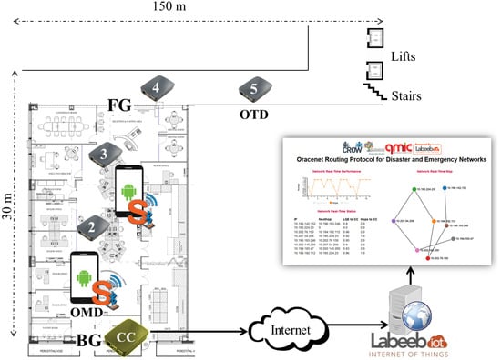 In our experiments, we consider a disaster scenario in our office, Qatar Mobility Innovations Center (QMIC), in Qatar Science and Technology Park (QSTP). Our test-bed consists of four Raspberry Pi devices (Raspberry Pi Foundation, Cambridge, UK) and two rooted Samsung Galaxy S3-I9300 smart phones (Samsung Electronics Co. Ltd., Suwon, South Korea) with the ORACE-Net routing protocol implemented. The office map is shown in Figure 5. The scenario is as follows: rescue teams access the office from the Back Gate (BG). First, they deploy the CC node in a trusted and safe location (near the entrance gate) where they are connected to the Internet through an Ethernet or WiFi access point (these links could be provided with military microwave or satellite connections). Upon their entrance inside the office, rescuers start deploying tactical devices (OTD) as base stations in order to have the maximum wireless network coverage in the operations area. Two to five OTDs are deployed (as shown in Figure 5). Mobile nodes (smart phones) carried by the rescuers are connected (to the CC node) through the tactical network. Shimmer sensors are connected to ORACE-Net mobile devices via Bluetooth. Since the experimentation area is limited, we reduced the Raspberry Pi’s and smart phone’s WiFi antenna transmission power to 0 dBm. Experimentation parameters and configuration settings are detailed in Table 2.