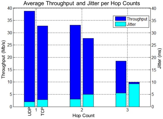 Now, with regards to the hop counts, UDP and TCP throughput averages within one hop are 38.8 and 32.71 Mb/s, respectively. Throughput decreases when the hop count increases to reach 18.47 and 9.87 Mb/s for UDP and TCP, respectively, within three hops. According to the authors of [33], a minimum data rate of 10 Mb/s is required for audio, medical imaging and video and hundreds of kbps for other WBAN applications. It is perceived that CROW achieved a real throughput higher than the data rate requirements. It is also important to note that the throughput is expected to decrease significantly starting from four hops based on the behavior shown in Figure 7. The average throughput reduction is accompanied by jitter increase. Recorded jitter values increase also following the same pattern as the throughput. It is important to note here that the maximum accepted jitter for the video streaming application must be less than 40 ms according to [34] and under 30 ms according to Cisco for interactive video (video-conferencing) [35]. Indeed, jitter reaches 9.227 ms with TCP mode within three hops, which stays under the limits of the use of video-streaming. According to the results of throughput and jitter, we conclude that the recommended hop count that guarantees throughput for audio/video streaming and files (i.e., photos, reports, etc.) might be less than or equal to three hops, according to the standard definition video (3 Mb/s). The CROW system assures an acceptable throughput and jitter for routes less than or equal to three hops with regards to the required thresholds cited above.