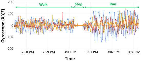 Gyroscope records over 5 min during the experiment. The X-axis is real time.