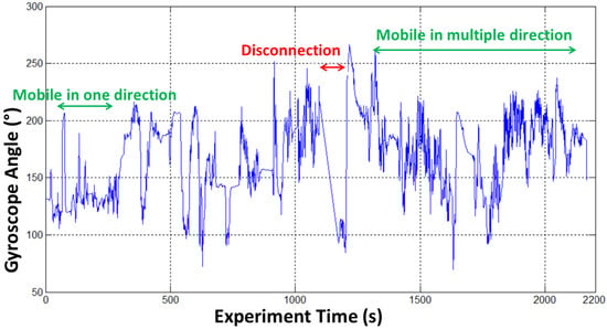 On-body sensors carried by the rescuers push data regularly to the IoT platform. Based on the type of recorded data, we can extract several human behaviors. For instance, gyroscope data recorded and depicted by the Labeeb-IoT platform in Figure 9 inform about human mobility. Sensors placed on the hand detect and send gyroscope variations tending to zero when the human has stopped and is not moving. Small variations may be distinguished in the first part of the figure when the human is walking and higher variations of the gyroscope when he/she is running. Figure 10 depicts the gyroscope angle variations over more than 2000 s. The gyroscope angle informs about the movement direction. Furthermore, some vital sign information may help the command center to switch rescue teams and send support there; we cite for example magnetometer and heart beat variations reflecting the stress level. All collected data on the IoT platform side could provide also the connectivity status for every deployed node, as can be seen in Figure 10. Disconnected nodes inform about the unavailable intermediate links or network over-saturation.