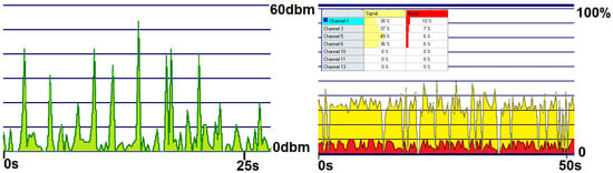 As given by Table 2, the CROW ad hoc network is configured on WiFi Channel 1. Figure 11a shows a sample of the interference score recorded indoors along 25 s. Interference varies from 0–53 dBm (as the maximum peak recorded). We assumed during our previous work [3] that the overall network achievements were affected by the indoor interference caused by WiFi access points, microwaves, etc. Thus, we have recorded the interference score and noise to verify whether these facts affect the overall behavior of the emergency network or not. The recorded interference is important compared to the Received Signal Strength Indicator (RSSI), so the signal is notably affected by the interference. However, the overall interference score is likely to decrease because the wireless infrastructure devices and access points are mostly out-of-order post-disaster. Figure 11b shows a sample of real-time variation for signal and noise strength as a percentage for Channel 1 during 50 s. The noise floor is given by the red curved waves, and the Signal-to-Noise Ratio (SNR) is depicted in yellow color. The figure shows that the signal strength varies between 3 and 50%. To conclude, interference clearly affects the RSSI and, then, the overall performance of the system. Interference is an important factor that must be considered in indoor emergency operations.