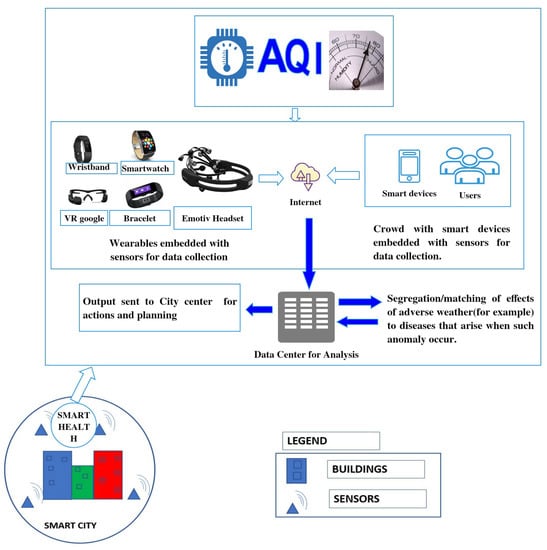 As recent research states, proper management and development of smart health is the key to success of the smart city ecosystem []. Smart health involves the use of sensors in smart devices and specifically manufactured/prototyped wearable sensors/bio-patches for proper monitoring of the health status of individuals living within a smart city, as shown in Figure 1. This example depicts a scenario for air quality monitoring to ensure healthier communities. Smart city infrastructure builds upon networked sensors that can be either dedicated or non-dedicated. As an integral component of the smart city, smart health systems utilize devices with embedded sensors (as non-dedicated sensing components) for environmental and ambient data collection such as temperature, air quality index (AQI) and humidity. Besides, wearables and carry-on sensors (as the dedicated sensing components) are also utilized to acquire medical data from individuals. Both dedicated and non-dedicated sensory data are transmitted to the data centres as the inputs of processing and further decision making processes. To achieve this goal, the already existing smart city framework coupled with IoT networking needs to be leveraged.