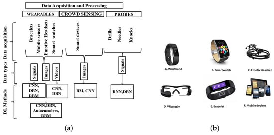 Accurate data acquisition and processing is key to effective healthcare delivery. However, ensuring the accuracy of the acquired data has been one of the typical challenges in smart healthcare systems. This is due to the nature of data needed for quality assurance of healthcare delivery and the methods used for data acquisition. This phenomenon in the acquisition of sensory data in healthcare applications has led to the development of innovative techniques for data acquisition with the aim of complementing the “already in use”, but upgraded methods. Due to these improvements in data acquisition methods, processing and interpreting sensory data have experienced an upward improvement, as well. These improvements have recently translated into improved quality of healthcare delivery. In this section, we briefly discuss the methods of sensory health data acquisition and processing as they relate to deep learning. Furthermore, we discuss how the generated sensory data types are processed using deep learning techniques. Figure 6a presents a brief taxonomy of data acquisition and processing. Data acquisition is performed mainly via wearables and probes as dedicated sensors and via built-in sensors of mobile devices as non-dedicated sensors.