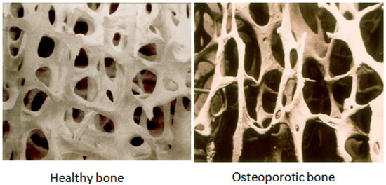 Bone is a metabolically active tissue that is continuously being remodeled throughout an individual’s lifetime, first being broken down (bone resorption) and then being rebuilt (bone formation) [3]. During childhood and teenage years, formation occurs faster than resorption; as a result, bones become heavier, larger and denser. This condition will continue until peak bone mass (maximum bone density and strength) is reached around age 30, and during 30–45, the bone condition will be relatively stable. After that, bone resorption begins to overpass bone formation. For women, bone loss is quickest in the first few years after menopause. The modelling and remodeling process of bone directly influences bone’s mechanical structure and its strength. Under normal conditions, bone formation and bone resorption are tightly coupled to each other in order to provide a balance in skeletal metabolism. Usually, osteoporosis occurs when bone formation and bone resorption are uncoupled, and the process of bone resorption happens at a higher rate than bone formation. Figure 1 shows the difference of bones between a healthy person and an osteoporotic patient.