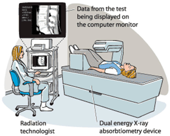 According to the World Health Organization (WHO), dual-energy X-ray absorptiometry (DXA) is the most accurate way and the gold standard technique to diagnose osteoporosis by measuring the bone mineral density (BMD) osteoporosis [8]. DXA scan (Figure 2) uses dual X-ray beams at two photon energies to measure BMD. Dense bones allow less of the X-ray beams to pass through them.