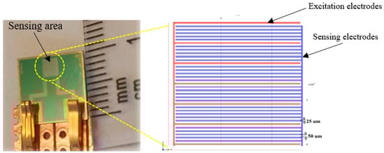 Etching and photolithography techniques were used to fabricate the interdigital sensors used in this work. A total 36 sensors were designed on a four-inch silicon wafer. The gold electrodes with 500 nm thickness were patterned on the silicon substrate using the sputtering method. Each sensor has a dimension of 10 × 10 mm2 including a sensing area of 2.5 × 2.5 mm2 [18]. Figure 4 shows a silicon sensor with a 1-5-25 configuration that includes five sensing electrodes between two excitation electrodes with 25 µm spacing between the consecutive electrodes. The average penetration depth of electric field for deionized water was calculated to be 212.5 µm [19].