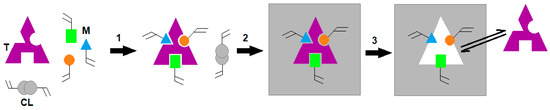 In order to introduce selectivity to the sensor, the sensing area will be coated by artificial antibodies. The coating materials to detect CTx-I will be created by molecular imprinted polymer (MIP) technology. Molecular imprinting is an inexpensive and relatively inexpensive technique that allows the creation of artificial recognition sites in synthetic polymers. Figure 5 shows the general principle of molecular imprinting technology. A template molecule (T) is mixed with the functional monomers (M) and then a cross-linker (CL) forms a self-assembled complex (1); The polymerization of the resulting system produces a highly cross-linked structure including imprinted sites (2); Finally, template molecules are extracted from the polymer matrix living cavities that can selectively recognize and bind the target molecule (3) [20]. MIPs have considerable potential for applications in the areas of clinical analysis, medical diagnostics, environmental monitoring, and drug delivery. Molecular imprinting technology allows the creation of synthetic receptors with binding constants comparable to natural receptors, but capable of withstanding much harsher conditions such as high temperature, pressure, extreme pH, and organic solvents compared to proteins and nucleic acids. These materials are also less expensive to synthesize and can be manufactured in large quantities with good reproducibility [21]. Artificial antibodies are appropriate alternatives to natural antibodies and biological receptors.