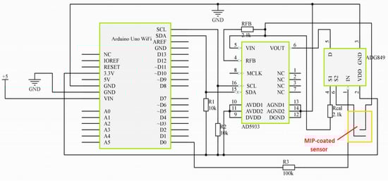 An AD5933 [25] impedance analyzer was used to collect the impedance information which was generated due to different CTx-1 concentrations. I2C protocol [26] was used to collect the impedance data from the coated sensor. A battery was used to supply power to the microcontroller. Eventually, the measured CTx-1 concentration was transferred to an IoT-based cloud server in order to provide the data to a practitioner for further assessment and investigation. An ADG849 switch was used to calibrate the system before every measurement. The microcontroller collects the impedance data from the impedance analyzer and uses the standard calibration graph to calculate the CTx-1 concentration. The circuit diagram of the proposed PoC device is shown in Figure 6.