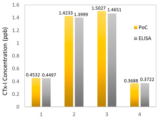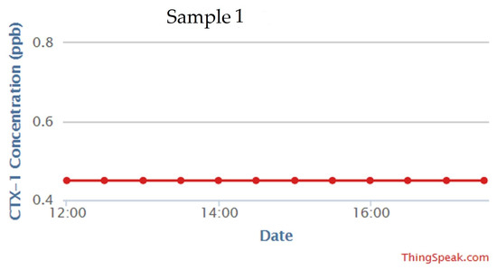 Unknown real serum samples collected from sheep blood were tested using the developed sensing system to measure the concentration of CTx-1. The results were validated using a serum CrossLaps® ELISA kit. Figure 8 shows a comparison between the PoC results and the ELISA results. The real-time data from the developed device is shown in Figure 9. The graph is developed to show the capability of the developed sensing system to transfer the measured data to the IoT-based cloud server at frequent intervals. As changes in CTx-I levels are evident after almost three weeks, the intervals between the real measurements should be at least three weeks.