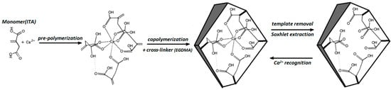 Calcium-imprinted polymers can be prepared using ion imprinted polymers (IIPs) by solidification of polymers in the presence of calcium ions as the template. IIPs have been increasingly developed during the last 20 years, on the principle of MIPs. Ion imprinting technology is a useful approach to synthesize artificial materials as biomimetic antibodies that can recognize any target ions [36]. A Ca2+ selective polymer can be synthesized by precipitation polymerization using calcium ions as the template, itaconic acid (ITA) as the functional monomer, EGDMA as the cross-linker, and 2,2-azoisobutronitrile (AIBN) as the initiator. Figure 10 represents the schematic of the method of Ca2+-IIP and the related recognition mechanism [37].