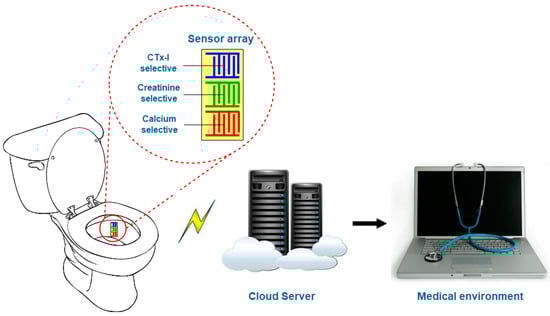 A multiplex assay can be developed by designing a sensor array for better and quicker measurement of calcium, CTx-I, and creatinine biomarkers. The developed device could be attached to toilet for automatic sampling of urine. The simultaneous measurement of calcium, CTx-I and creatinine will be done and the measured values would be transferred to the medical practitioner for further investigation. The graphical illustration of the future sensing system is shown in Figure 11.