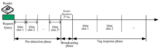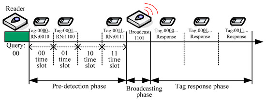 - Broadcasting phase: After the predetection phase, the reader can encode the state of each time into bit 0 or 1. The success state is encoded into bit 1, and both idle and collision states are encoded into bit 0. Then, in the broadcasting phase, the reader sends the binary string representing the status of each time slot to tags, so that those tags with IDs that match the prefixes can realize how many time slots are allocated and which are available to respond with their IDs.