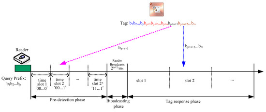 - Predetection phase: The purpose of the predetection phase is to collect information about tags to understand the overall distribution of tags. To do so, the reader allocates many tiny time slots, and each tiny slot will be responsible for collecting tag information for a particular group. These tiny slots are allocated for collecting tag’s information, instead of tag’s ID. Once the time slot has information available, reader can understand the distribution of tags for that particular group, and this distribution information will help the reader for determining if the time slot is needed to receive tag’s ID during the tag response phase. There are 2n tiny time slots numbered from 0 to 2n − 1 and each time slot can be represented as an n-bit binary string. Once a tag matches the prefix string, it will respond a message to the tiny slot that has the same label as next n-bit of tag’s ID. The message of tags to respond depends on the width of each tiny time slot. In general, the width of these slots is smaller than the length of the tag’s ID, in order to reduce the communication overhead. After receiving responses from tags, the reader can recognize the status of each tiny slot: idle, success, or collision. When no tag responds, it leads to an idle state. When only one tag responds, it is recognized as a success state. When more than one tag tries to respond to the reader’s query, the reader can recognize it as a collision state.