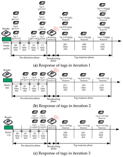Iteration 1: First of all, the waiting queue is empty and the reader sends the empty-prefix to the tags and allocates four time slots for the predetection phase. All tags respond to this empty-prefix request command. In this case, tags A, B, and C respond on the 00 time slot and send bit 1 to the reader. Tag D responds on the 10 time slot with bit 0. Tags E, F, G, and H respond on the 11 time slot, both with bit 0, to the reader. After receiving the responses from tags, the reader can realize the status of four time slots in the predetection phase as 1-success in the 00 slot, idle in the 01 slot, 0-success in the 10 slot, and 0-success in the 11 slot. Thus, the broadcasting string representing the status of the time slots in the predetection phase is encoded as 01001010. This indicates that there will be three time slots, namely 001, 100, and 110, allocated in the tag response phase. After receiving the broadcasting string, tags A, B, and C will respond with 01010, 10101, and 11011, respectively, to the reader on time slot 001. As a result, the reader detects a collision and 001 will be added to the waiting queue for further query. Furthermore, tag D responds with 11100 on slot 100, which can be successfully identified by the reader. Tags E, F, G, and H will all respond on time slot 110 with 10001, 10101, 11001, and 11010, respectively. Then a collision is detected and 110 will be added to the waiting queue. Figure 4a shows the situation that occurs in this iteration.