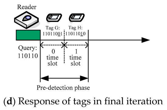 Iteration 4: The reader takes the prefix string 110110 out of the queue for further query. At this moment, the length p of the prefix string is 6, which satisfies the condition of the special case as mentioned above; that is, p + n = m. Therefore, the reader will change the value of n to 1 and send the prefix string and n to tags. This means that, in the predetection phase, only two time slots will be allocated for tags to respond. In this case, tag G will respond on time slot 0 with bit 1 and tag H will respond on time slot 1 with bit 0. Since tags G and H are responding with their last bit of ID to the reader in the predetection phase, the reader can identify their IDs according to the status of their corresponding time slot. In this case, both time slots for tags G and H are recognized as success states. Thus, both tags can be identified immediately and no tag response phase is needed. Figure 4d shows the situation.
