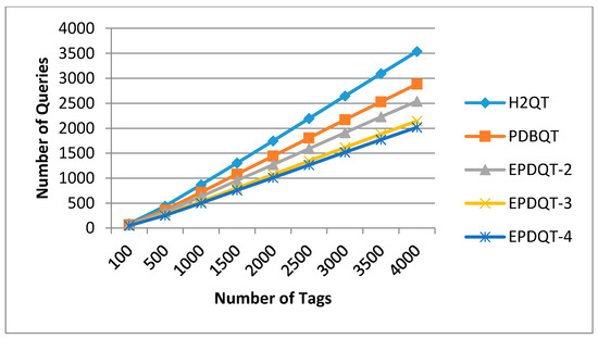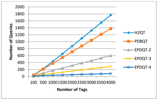 This experiment evaluates the effect that the number of tags has on the performance of number of queries needed by the reader to complete the tag identification of the H2QT, PDBQT, EPDQT-2, EPDQT-3, and EPDQT-4 approaches. The results are shown in Figure 5. In this graph, we can see that as the number of tags increases, the number of queries of each algorithm increases linearly. This is obvious, because the number of queries is proportional to the number of tags. Furthermore, the number of queries is also dependent on the number of collisions that occurred during the identification process. Therefore, as the number of tags increases, the number of collisions increases proportionally, which implies that the number of queries increases as well. However, our proposed EPDQT schemes require fewer queries compared with other schemes. For example, when t = 4000, the number of queries needed by the reader in the H2QT, PDBQT, EPDQT-2, EPDQT-3, and EPDQT-4 protocols is 3539, 2883, 2540, 2145, and 2018, respectively. Thus, our proposed EPDQT schemes perform around 29% to 43% better than the H2QT scheme. This is because the EPDQT protocols generate fewer collision slots. It can also be seen that the number of queries in EPDQT-4 is around 19% less than in EPDQT-2. This shows that for the EPDQT schemes, the number of queries decreases as the parameter increases, since more time slots are allocated in the predetection phase to identify more tags.