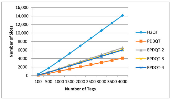 This experiment examines the effect that the number of tags has on the number of total slots generated by the reader to complete tag identification of the H2QT, PDBQT, EPDQT-2, EPDQT-3, and EPDQT-4 approaches. In this experiment, we ignore the tiny slots in the predetection phase and take only the number of slots that occurred in the tag response phase into account, since it will take more time to finish the process compared to the time spent in the predetection phase. The slot comparison results are given in Figure 6.
