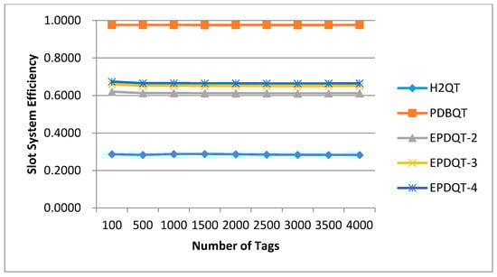 In the following, we examine the effect that the number of tags has on system efficiency in terms of slots and time for the H2QT, PDBQT, EPDQT-2, EPDQT-3, and EPDQT-4 approaches. Results for slot system efficiency and time system efficiency are presented in Figure 8 and Figure 9. In terms of slot system efficiency, each of the compared approaches experiences similar system efficiency as the number of tags increases. For example, the slot system efficiency of the H2QT, PDBQT, EPDQT-2, EPDQT-3, and EPDQT-4 protocols is around 28.51%, 97.68%, 62.04%, 65.16%, and 66.58%, respectively, all of which are independent of the number of tags. The rationale behind these results is quite clear. Since the numbers of identification slots and total slots both increase as the number of tags increases, slot system efficiency almost flattens. Furthermore, slot system efficiency of the PDBQT, EPDQT-2, EPDQT-3, and EPDQT-4 protocols significantly outperforms the H2QT protocol. The rationale behind this result is also clear. In the H2QT protocol, each query cycle allocates four time slots for tags to respond. Some of the slots may receive one tag’s response and then identify the tag’s ID, but the rest of them may receive multiple tags’ responses or no response, and as a result the slot may collide or be idle. Therefore, the utilization of slots in H2QT is poor. On the other hand, in predetection-based protocols, no idle slot is allocated and most of the collisions are detected during the predetection phase. As a result, the allocated slots are almost used for identifying tags. However, the PDBQT protocol outperforms the EPDQT protocols, since it reduces most collision slots. Furthermore, for the EPDQT protocols, as the parameter increases, slot efficiency increases. Figure 8 shows that when t = 4000, the EPDQT-4 protocol performs around 5.3% better than the EPDQT-2 protocol.