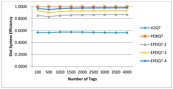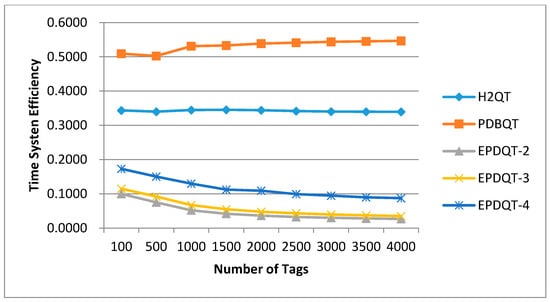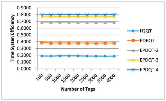 In terms of time system efficiency, as shown in Figure 9, each of the compared approaches experiences similar time system efficiency as the number of tags increases. For example, time system efficiency of the H2QT, PDBQT, EPDQT-2, EPDQT-3, and EPDQT-4 protocols is around 18.66%, 38.05%, 68.95%, 76.71%, and 79.85%, respectively, all of which are independent of the number of tags. The reason behind this result is similar to the reason for slot system efficiency. Furthermore, time system efficiency of the PDBQT, EPDQT-2, EPDQT-3, and EPDQT-4 protocols also significantly outperforms the H2QT protocol. The rationale behind this result is quite clear. Since there are many more queries in the H2QT protocol than in the predetection-based protocols, by adding the time for reader query commands and the waiting time from reader query to tag response, time system efficiency of H2QT is lower than other protocols. Furthermore, the proposed EPDQT protocols outperform the PDBQT scheme by around 30% to 41%. The rationale behind these results is quite clear. Since the communication overhead in the predetection phase of the proposed EPDQT protocols is much less than that in the PDBQT protocol, the time for each query cycle in EPDQT is much less than in PDBQT. As a result, the proposed EDPQT protocols can achieve better time system efficiency than the others.