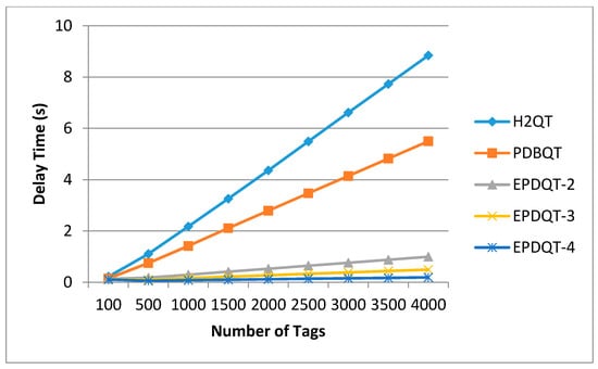 This experiment examined the effect that the number of tags has on the total time required to complete tag identification of the H2QT, PDBQT, EPDQT-2, EPDQT-3, and EPDQT-4 approaches. The time comparison results are shown in Figure 7.