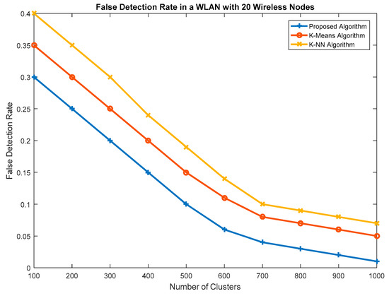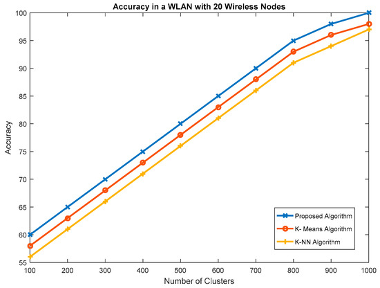 The proposed clustering techniques can be applied to packets from different wireless nodes that are quantitative, qualitative, or a mixture of both. In this algorithm, a cluster is a collection of packet objects that are similar to one another within the same cluster and dissimilar to the objects in other clusters. The proposed clustering algorithm can also be applied to large datasets of different wireless communication systems. The grouping is done by minimizing the sum of squares of distances between wireless nodes and the corresponding cluster centroid [32]. The proposed algorithm has the following advantages: (1) perform online clustering and classification; (2) establish strong background to expend the current WLANs to ultra-low-power WLANs. The proposed algorithm is defined based on the following assumptions: (1) total of N wireless nodes; (2) denote K as the number of random sparse wireless nodes; (3) K is a random number and is much smaller than N; (4) denote [D]N×1 as the packet vector in the WLAN; (5) assign each component of [D]N×1 like a random value; (6) [D]N×1 is a sparse vector since K ≤ M<< N; (7) there are M active monitoring wireless nodes trying to capture K events.