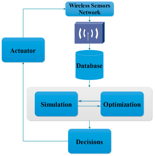 A number of studies have tried to tackle the sustainable management problems of groundwater resources using monitor systems and model simulations [8,9,10]. Groundwater flow and land deformation was integrated in an anisotropic aquifer system. The model was applied to conduct pumping recovery tests under various conditions in order to design groundwater pumping projects for Shanghai, China [11]. Carmen et al. proposed a hydro-economic model to balance the trade-off between sustainable management of groundwater resources and the cost of overexploited aquifers in the Segura basin, Southeast Spain [12]. Huo et al. integrated a soil and water assessment tool (SWAT) for simulating surface water and MODFLOW for simulating groundwater in order to explore the discharge from rivers under future predictions [4]. A few optimization techniques have been used for irrigation management [6,13,14,15,16]. Sadeghi-Tabas et al. proposed an attempt to link MODFLOW to a multi-algorithm genetically adaptive search method (AMALGAM) to optimize pumping rates of a groundwater system in Iran [17]. A surrogate-based approach was developed based on integrated surface water-groundwater modeling to optimize the percentages of surface water and groundwater in irrigation water in order to obtain a better balance between groundwater storage in the middle reaches of HRB and the environmental flow in the lower reaches [18]. Hamid R. Safavi and Mehrdad Falsafioun combined a genetic algorithm optimization model with scenario analysis to develop an optimal plan for the conjunctive use of surface water and groundwater resources in Zayandehrud Basin, Iran [19]. However, these researches were based on static data, which were relatively obsolete.
