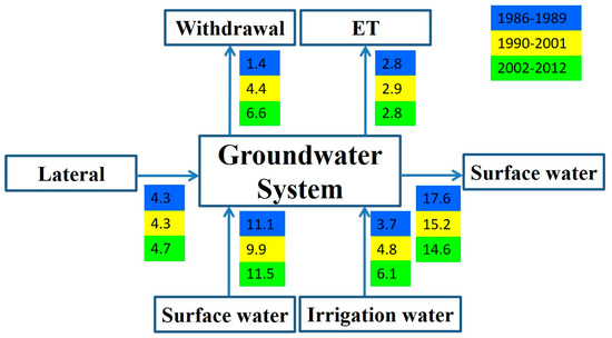 The groundwater pumping data, irrigation data, and the cultivated areas obtained from WestDC [33] were divided into three periods (1986–1989, 1990–2001, and 2002–2012). Therefore, the water balance for the middle reaches of the HRB was analyzed corresponding to the three periods (Figure 4). Figure 4 indicated that the main groundwater recharge source of the study area was the leakage from the Heihe River, which accounted for about 50% of the total recharge amount. Other important sources of groundwater recharge were the irrigation backflow and the lateral inflow from the mountain area, which accounted for about 27% and 21%, respectively. The principal sink term of the groundwater was the drainage from the groundwater to the river, which accounted for about 80%, 67%, and 60% of the total amount in different periods. The difference between periods represented the groundwater dynamics, which is mainly due to the different groundwater exploitations in different periods. In addition, the figure also indicates that the groundwater system was under negative water balance for almost 30 years.