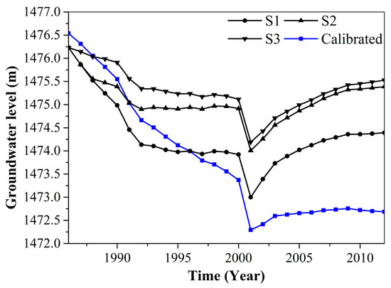 The optimized groundwater levels for S1, S2, and S3 and the base condition (the calibrated groundwater level) at the Daman observation well.