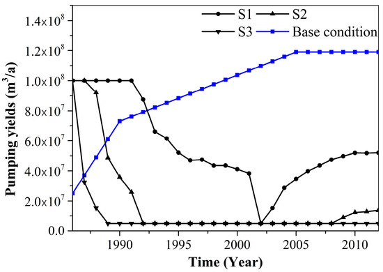 The optimized pumping yields for S1, S2, and S3 and the base condition (the pumping yields from the collected data) of the Daman irrigation district.
