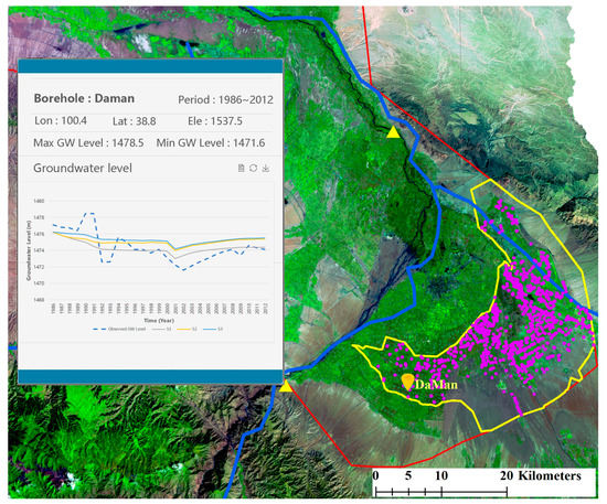 The scheme of the real-time groundwater management system is illustrated in Figure 2. Recent achievements in hydrology tended to benefit from the development and application of sensor technology, wireless communication, and information infrastructure. Six groundwater probes (HOBO water level Logger U20-001-01 and U20-001-01-Ti) were installed in the middle reaches of the Heihe River Basin (Figure 1) with the capability of recording the pressure of the groundwater (which could be used to obtain the groundwater level) and the temperature of the groundwater. One of the probes was deployed in the Daman borehole. All sensors were connected to a data logger, and the data recording interval was setting to one hour. The groundwater depth could derive from the pressure of the groundwater. Together with the depth of HOBO and the elevation from differential global positioning system (GPS), the groundwater level was calculated. The observed data was relayed to the database via the General Packet Radio Service (GPRS). The groundwater level was used by the simulation–optimization model to generate an optimal water usage scheme in order to assist in decision-making. The decisions would have positive or negative effects on the groundwater resources, effects that could be later observed by the probes. As building this real-time management system of groundwater was our first attempt, the time interval was set to one year. The observed data by HOBO was averaged to the system time interval.