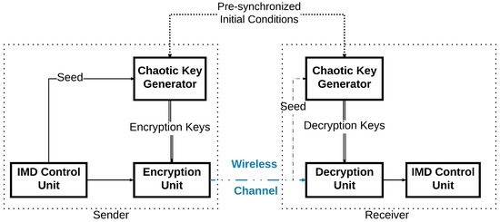 In this work, we intend to protect the IMD wireless communications through developing an efficient encryption scheme. We will design a novel technique to generate pseudo-random keys to be used as cryptographic symmetric keys similar to the work in [8]. This key will be employed to cipher the exchanged packets between the devices used by patients and their doctors. This work does not aim specifically at a specific IMD but tackles any implantable systems that use wireless communications between its devices, e.g., an implanted pacemaker and its external monitoring device [9]. In addition, we also present a new encryption system to protect the wireless communication between the IMDs. In the sender’s device, a key generator will generate an encryption key using a Pseudo-Random Number Generator (PRNG) based on a chaotic system [10]. This key will be applied to cipher the message to be sent by the device. In order for the receiving device to be able to decipher the sent message, it has to generate internally the same encryption key used in the first place. The sender will not communicate the key directly on the wireless channel. The sender needs only to communicate publicly the seed used for its encryption key generation as shown in Figure 2. Even though the seed is thought to be enough to generate the same key, the case of the chaotic system differs: the two devices use the same chaotic generator to deliver the encryption key. However, this pseudo-random generator has two inputs instead of one: the seed and the initial conditions. The initial conditions are already shared between the two devices through a given physical synchronization method. Therefore, when the receiver receives this seed, its internal key generator will be able to generate the right key to be used for deciphering the message it has received. Thus, the wireless communication can take place securely.