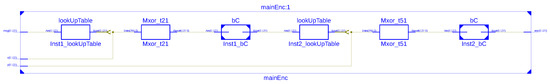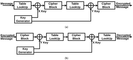 The cryptographic unit is composed of three parts: an XOR operator (a simple operator to hide the communication from simple eavesdropping), a Table LookUp unit and a Cipher block unit (described in Section 4.3.1 and Section 4.3.2). Additionally, it has two inputs incoming from the chaotic generator: the X Key and the Y key. The full scheme of both of the encryption and decryption systems is shown in Figure 6. The original message generated by the device starts by passing through the Table LookUp unit that shuffles the bits. Then, the result is operated with an XOR operation with the X Key. Next, the signal passes through the Cipher block unit. The resulted message re-enter again through the same units in the same order, only this time the XOR operation is achieved with the Y Key. Finally, the encrypted message is generated. The two times reinstantiation of the blocks is the minimal scheme to guarantee a robust cryptographic result. For medical systems with robust computational resources, a loop can be introduced into the system to increase the complexity of the encrypted message.