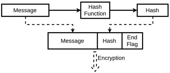 The first fundamental step for two devices to communicate securely using wireless communication with this protocol is to have synchronized initial conditions for the chaotic equations. If possible, the best approach to execute this is to synchronize it through a physical connection, as it is the most secure communication method. An alternative is to have these variables already be defined during the manufacturing process. Also, this synchronization applies to the case of the Table LookUp of the encryption unit. The device then starts with a communication request. This request identifies the sender and asks to receive the seed to start the encrypted communication. There is no threat in this step, as even if through spoofing, a third party receiving the seed from the asked device would not be able to establish a secure communication due to the lack of the initial conditions of the chaotic system. Afterwards, the second device generates a seed with its internal algorithm and sends it to the other end. When both devices have the shared seed, they can both use their implemented chaotic system to generate the same pseudo-random key. Therefore, a secure communication can be established. This process will protect the IMDs as it will ensure an encrypted communication, at the same time, the threat of achieving the encryption key by an external third-party is diminished. The devices have individual systems to generate this key, while the process itself has a low cost in the memory and computation process. This prevents the devices from sharing the key wirelessly and insecurely, and also can be programmed to change the encryption key at any needed time. The exchanged messages will include in their segments a Hash [34] segment (Figure 8) that can be simply generated using, for instance, a cyclic redundancy check algorithm [35].