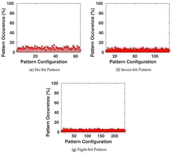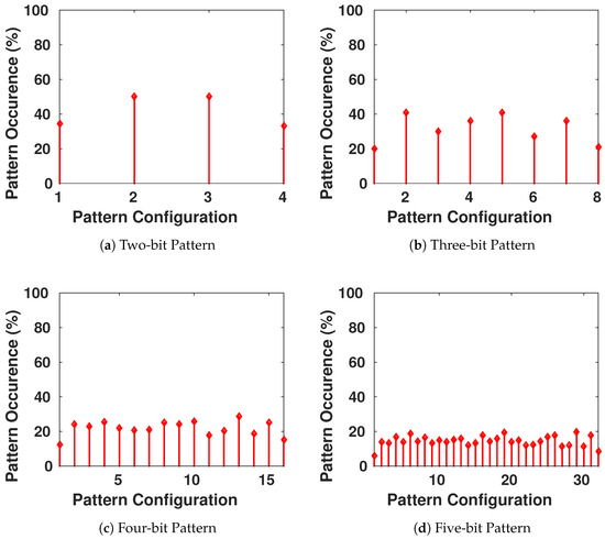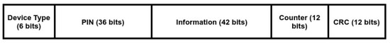 A main concern for the users is the pattern recognition of the messages, as explained in the work of Li et al. [32]. A typical message in IMDs with simple architecture is as shown in Figure 14. Several attempts to eavesdrop an unsecured message can lead to the identification of the flags of the different packets. Thus, the attacker can gain control over the communication. Figure 15 shows that even listening to a communication where messages have a recognizable pattern, this pattern is eliminated after encryption. In fact, Figure 15 demonstrates the change rate of bits after the encryption process of the same message when only one flag changes. Even though the same encryption parameters are used, the eavesdropper cannot pinpoint the patterns of the message, as the bits appear to randomly change all along the fixed-length packet.