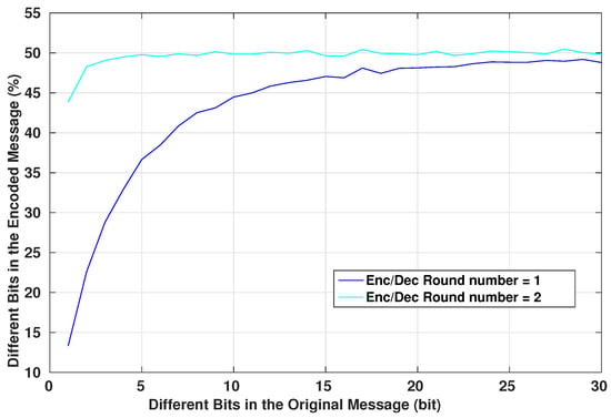 As explained in Section 4.1, diffusion is one of the main property of a good encryption system. It helps to increase the complexity of the statistical tests that an eavesdropper can perform on intercepted messages, prohibiting him/her from deciphering the format of the communicated packets and its potential contents and values. An eavesdropper cannot modify an intercepted packet and replay it to the system if he/she does not know what are the different parts of the packet and the role of each set of its bits. Figure 13 shows the relation between the number of the different bits of the original message and how they affect the encrypted message. The graph shows the mean value of changed bits in the encrypted message for a given number of bit changes in the original messages. The mean is computed such that the changes in the original messages occur in different bit locations. As we can see, for a slight change in the original message, the encrypted one has more variations in the bit values, even for a single-round algorithm. In fact, using one round in the encryption system is only dedicated to basic IMD that have a basic architecture and very limited resources and where the security aspect is not very demanded. However, this protocol still offers secure communication to the device. Adding an additional round to the encryption system will increase linearly the complexity of the encryption algorithm by a simple factor of two, however, the confusion and diffusion aspect of the system will be very strong. This can be seen from Figure 13. Also, the avalanche factor [37] of the algorithm will reach the value . The value 0.5 is the least requested value for a robust encryption algorithm, this ensures that more than half of the encrypted output will change on a single change of an input message bit. This will ensure that if there is a recognizable pattern in the input messages, the encryption system will scramble the bits in a way that this pattern is lost.