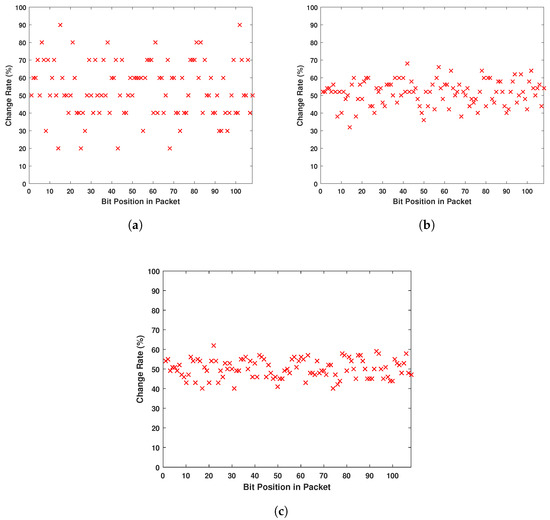 Bit Change Rate of the Packet When Only Flag Changes. (a) Eavesdropping 10 Different Messages; (b) Eavesdropping 50 Different Messages; (c) Eavesdropping 100 Different Messages.